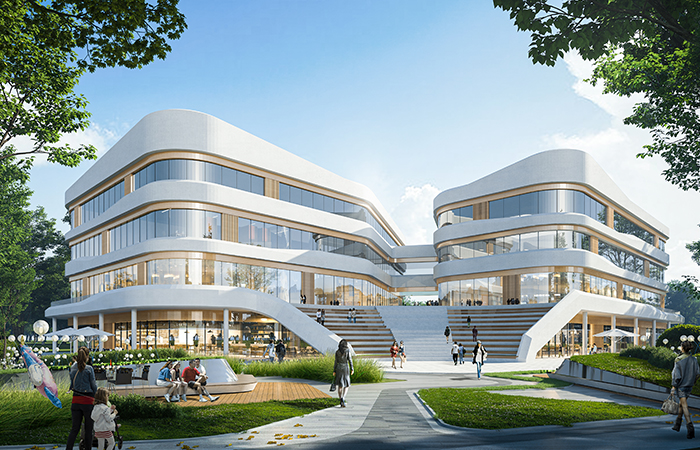 建筑色彩上以高明度、低彩度的暖色與米白為主色調(diào),局部輔以暖灰色。立面采用Low-e玻璃、鋁板等材料,充分表達(dá)建筑的現(xiàn)代感與未來(lái)感。
