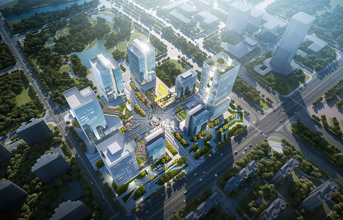 商業(yè)綜合體與鄰里中心,建筑體型與景觀空間互融,形體錯(cuò)動(dòng)豐富多變,金屬線條硬朗細(xì)膩,樹立現(xiàn)代門戶新標(biāo)。