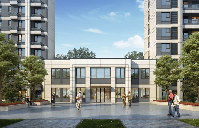 建筑屋頂進(jìn)收分設(shè)計(jì),柔化頂界面與街道的空間關(guān)系改善單調(diào)的天際線關(guān)系。在建筑屋頂部分進(jìn)行了頂部深化設(shè)計(jì),通過屋面頂部搭框架及格柵。突出本小區(qū)的特色與個性,同時也彰顯了都市的勃勃生機(jī)與昂揚(yáng)氣勢。立面以簡潔的橫向線條,精致細(xì)節(jié)的刻畫,簡約大氣而不失細(xì)膩。立面采用橫向線條凸出建筑張力,外立面材料簡約,細(xì)節(jié)精致,簡約現(xiàn)代;多層線條呈現(xiàn)的密檐意向,別具東方韻味。