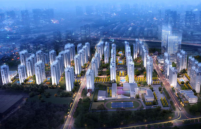 住宅以板式高樓為主,沿街及地塊中心布置點(diǎn)式高層;同時(shí)在沿城市主路及中心節(jié)點(diǎn)處,按區(qū)域降低高層建筑高度。建筑頂部塔樓采用平屋頂形式,低層采用平坡結(jié)合的屋頂形式,高低錯(cuò)落,局部退層,改善單調(diào)的天際線形象。