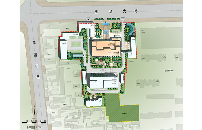 在總平面布局上,該設計主要以規(guī)整式布局為主,結合原有地形采用自然式布局,做到規(guī)整與自然式相結合,為病人提良好的就醫(yī)環(huán)境。本著合理安排資源和服務廣大人民群眾的基礎上,合理布局。新建門診醫(yī)技綜合樓位于整個地塊中部,北側規(guī)劃設計為開敞廣場并與道路相連,西側為行唐縣急救站,東側為傳染病樓,南側為病房樓。