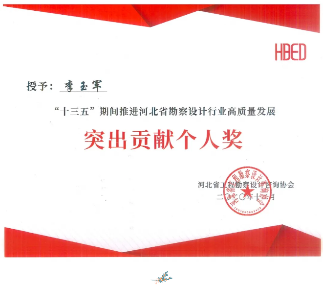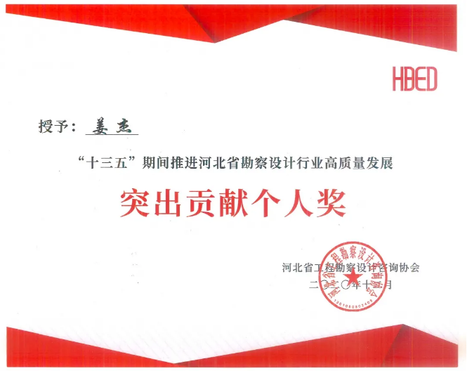 河北省勘察設(shè)計(jì)行業(yè)高質(zhì)量發(fā)展“突出貢獻(xiàn)個(gè)人”榮譽(yù)稱號。