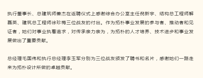 暨綜合辦公室主任倪新宇、結(jié)構(gòu)總工程師解磊英、建筑總工程師徐珍梅三位戰(zhàn)友的返聘儀式。