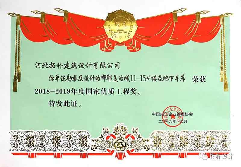 國(guó)家優(yōu)質(zhì)工程獎(jiǎng)設(shè)立于1981年,是經(jīng)國(guó)務(wù)院確認(rèn)的我國(guó)工程建設(shè)領(lǐng)域設(shè)立最早,規(guī)格最高,跨行業(yè)、跨專業(yè)的國(guó)家級(jí)榮譽(yù)獎(jiǎng)勵(lì)。拓樸設(shè)計(jì)榮獲“國(guó)家優(yōu)質(zhì)工程獎(jiǎng)”獎(jiǎng)項(xiàng),倍感驕傲和自豪。此前,邯鄲美的城項(xiàng)目也曾榮獲河北省優(yōu)秀工程勘察設(shè)計(jì)獎(jiǎng)中國(guó)土木工程詹天佑優(yōu)秀住宅小區(qū)獎(jiǎng)。拓樸設(shè)計(jì)初心依舊,砥礪前行!