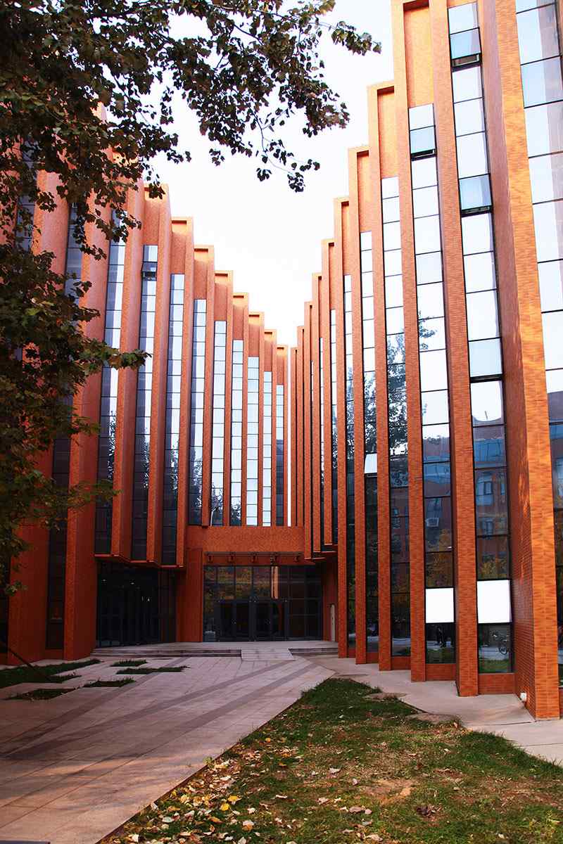 立面采用校園常用的紅磚手法,搭配鋼架及藍(lán)色玻璃幕,將傳統(tǒng)與現(xiàn)代相互結(jié)合,在給學(xué)生帶來濃厚傳統(tǒng)底蘊(yùn)的同時(shí)又不失現(xiàn)代創(chuàng)新的文化氣息。