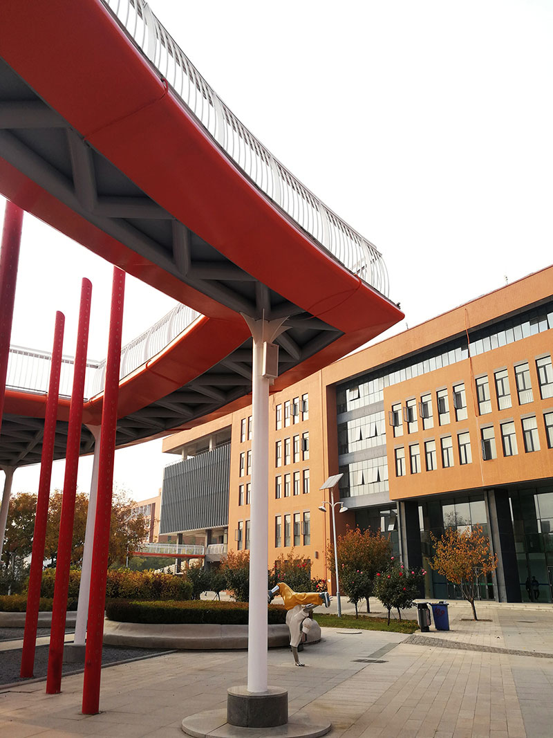 從整體規(guī)劃布局上看,校園內(nèi)各樓排布張弛有度,建筑與景觀相互結(jié)合,中央大湖與景觀廊架搭配蜿蜒蜷曲的步道,平靜中孕育詩(shī)意,給一所沉穩(wěn)的文化建筑帶來靈動(dòng)的韻律之美。